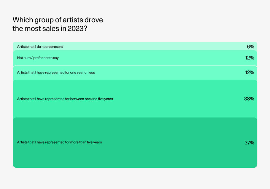 Unsurprisingly, represented artists are driving the most sales for galleries that have a roster of represented artists. The largest proportion (37%) of these respondents say that artists they have represented for more than five years drove the most sales for their gallery in 2023, followed by artists they have represented for between one and five years (33%). When asked what proportion of represented artists make up the most of their gallery sales, the highest percentage (30%) of respondents said that less than 20% of their represented artists constitute the majority of their sales, followed by 75–100% of their represented artists (19%).