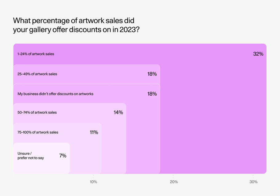Half of our respondents reported that their galleries offered discounts on less than 50% of the artwork sold in 2023, with 32% saying that they offered discounts on less than 25% of works, followed by 18% that said they offered discounts on 25–49% of sales. Just a quarter said that they offered discounts on more than 50% of their artwork sales, and 18% said they didn’t offer discounts at all.