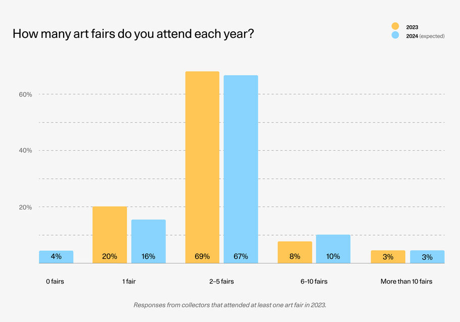 4. 67% of collectors are planning on attending 2–5 art fairs in 2024, roughly the same number as they did in 2023