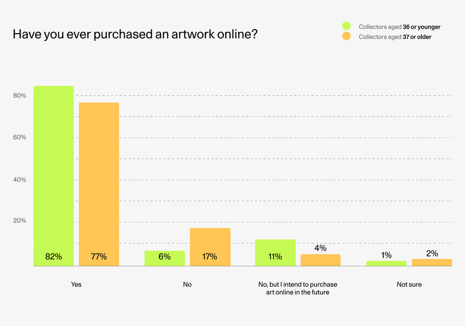 This new generation of collectors is also more likely to use online marketplaces as channels for discovery: 47% of younger collectors said that they discover artists and purchase their works via online marketplaces, compared to 43% of older collectors.