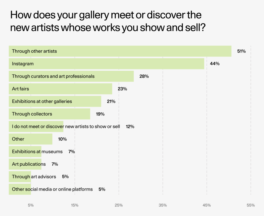 For artists and gallerists, networking pays off: More than half (51%) of respondents discover the artists they go on to work with through other artists.