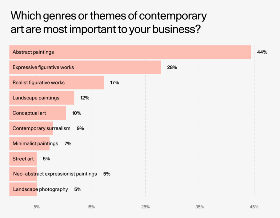 For 59% of respondents, non-figurative paintings (which includes abstract painting, as well as associated genres such as minimalist painting, spiritual abstraction, and neo–abstract expressionism) were selected as most important to their business now. In contrast, 45% of galleries ranked figurative painting highest.