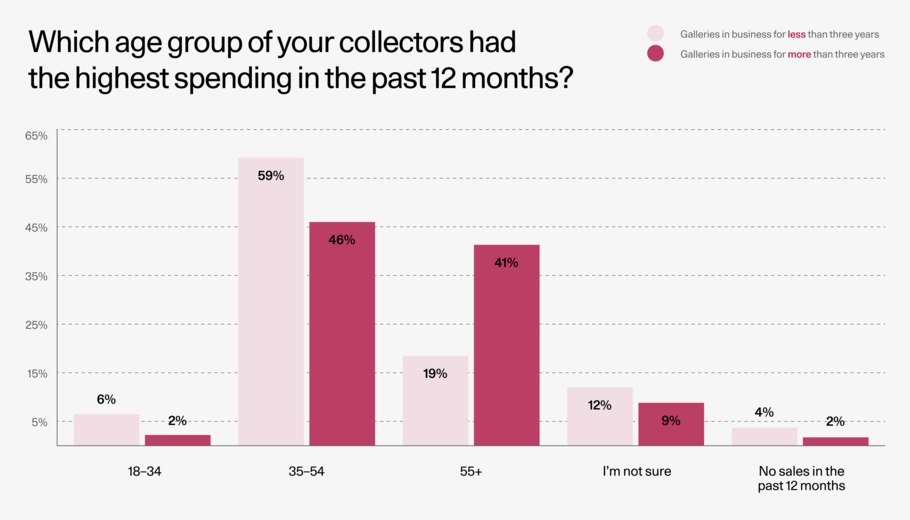 Youth is another thread that runs throughout our report. We see a marked difference in the interests and strategies deployed by younger galleries (those in business for less than three years), which are connecting with younger collectors and artists to a higher degree than their more established peers. Older collectors, meanwhile, are viewed by respondents as a whole to be less important to future sales: Only 10% ranked collectors aged 55+ as most important to the future growth of their business