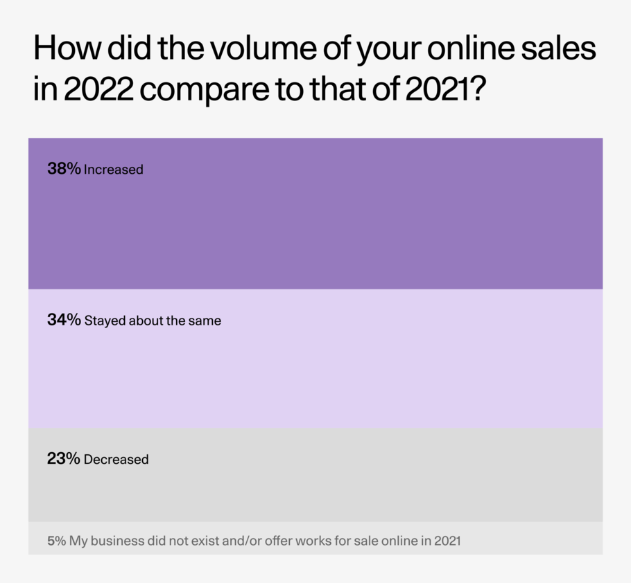 Although the physical art world has largely returned to its pre-pandemic state—more than 300 art fairs took place in 2022, and international travel is largely unrestricted now—our survey of galleries this year shows that online sales are still growing or stable. This year, when asked about the volume of online sales in 2022 compared to 2021, the largest group of respondents (38%) said that their sales volume increased, while another 34% said it remained consistent.