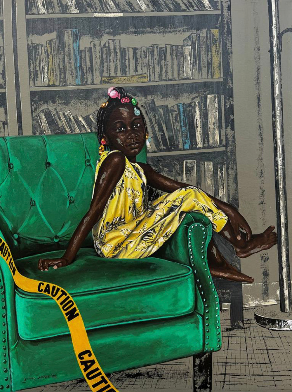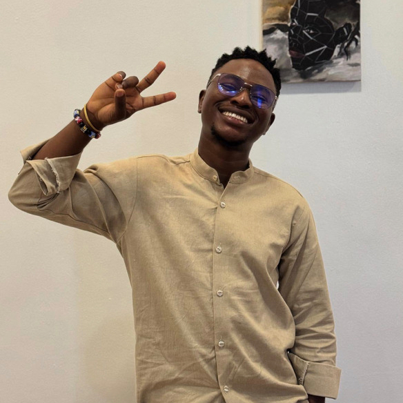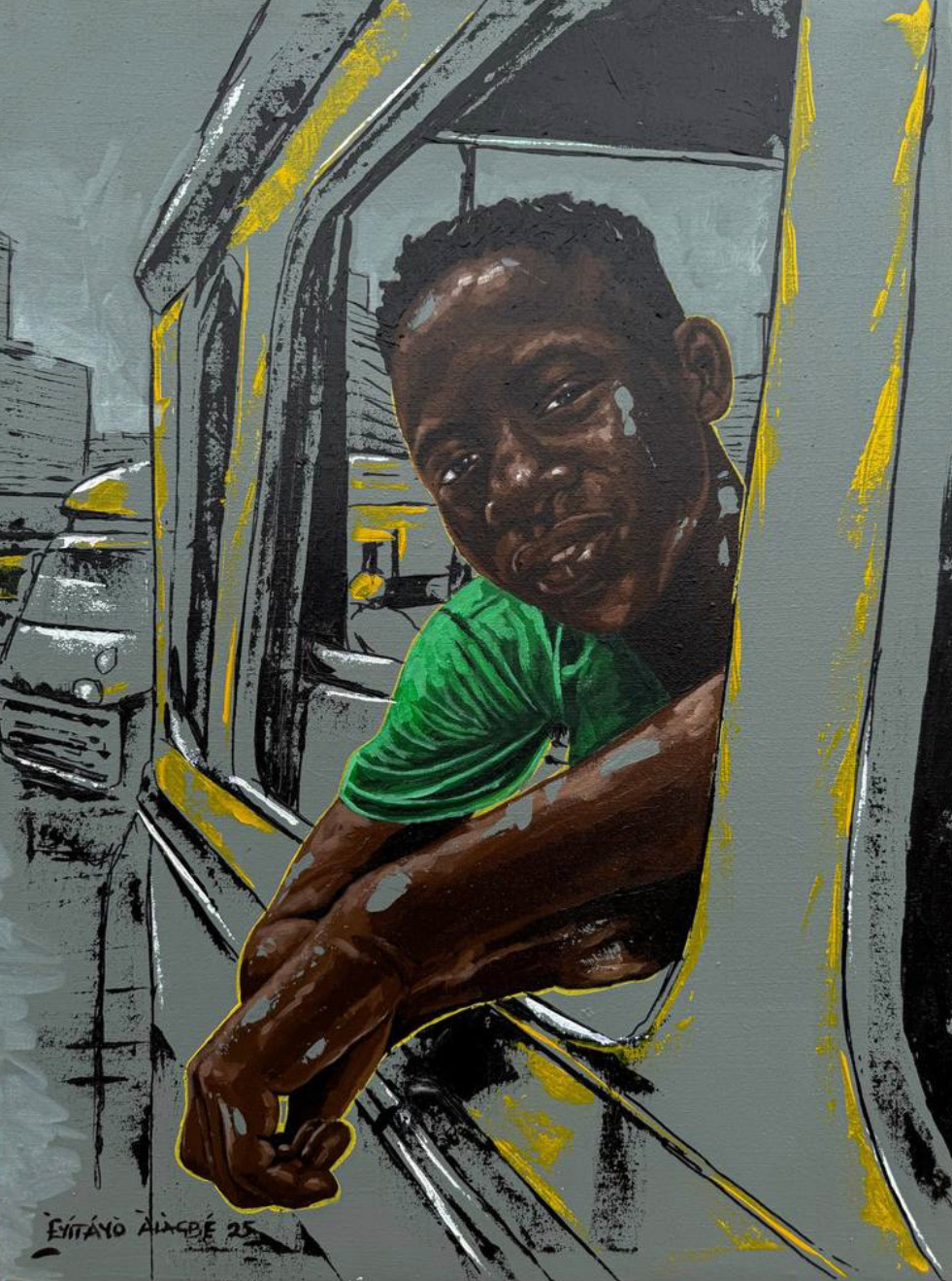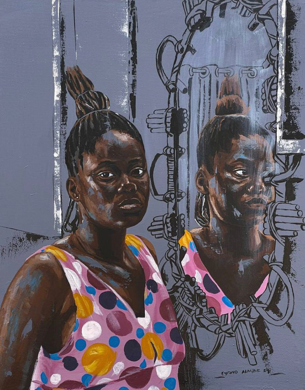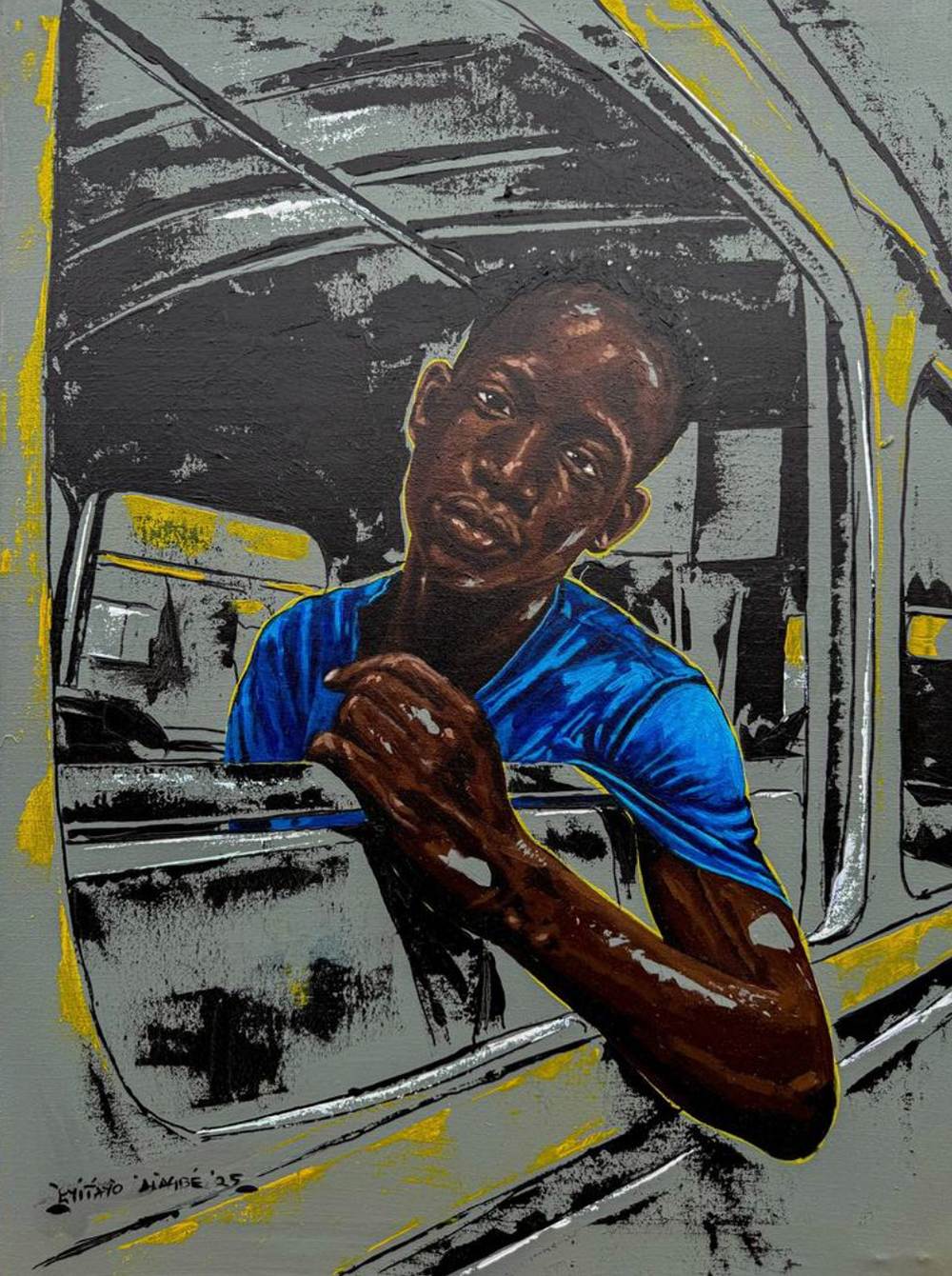 Eyitayo Alagbe (b. 1997) is a Nigerian multimedia visual artist based in Ibadan, whose work captures the depth and diversity of the human experience. Born and raised in Ogbomoso, Oyo State, he nurtured his artistic talent from an early age, later refining his craft through formal studies—earning an NCE in Fine and Applied Arts from Emmanuel Alayande College of Education, Oyo (2019), and a degree in Fine and Applied Arts from Obafemi Awolowo University (2023). Eyitayo’s practice explores themes of emotion, identity, and resilience, often centering on men’s mental health, the strength and beauty of African women, and the enduring perseverance of Africans. Through his dynamic and evocative creations, he invites viewers to reflect on shared struggles and triumphs, inspiring them to locate their own stories within the larger human narrative.