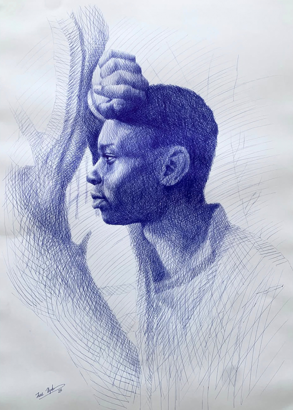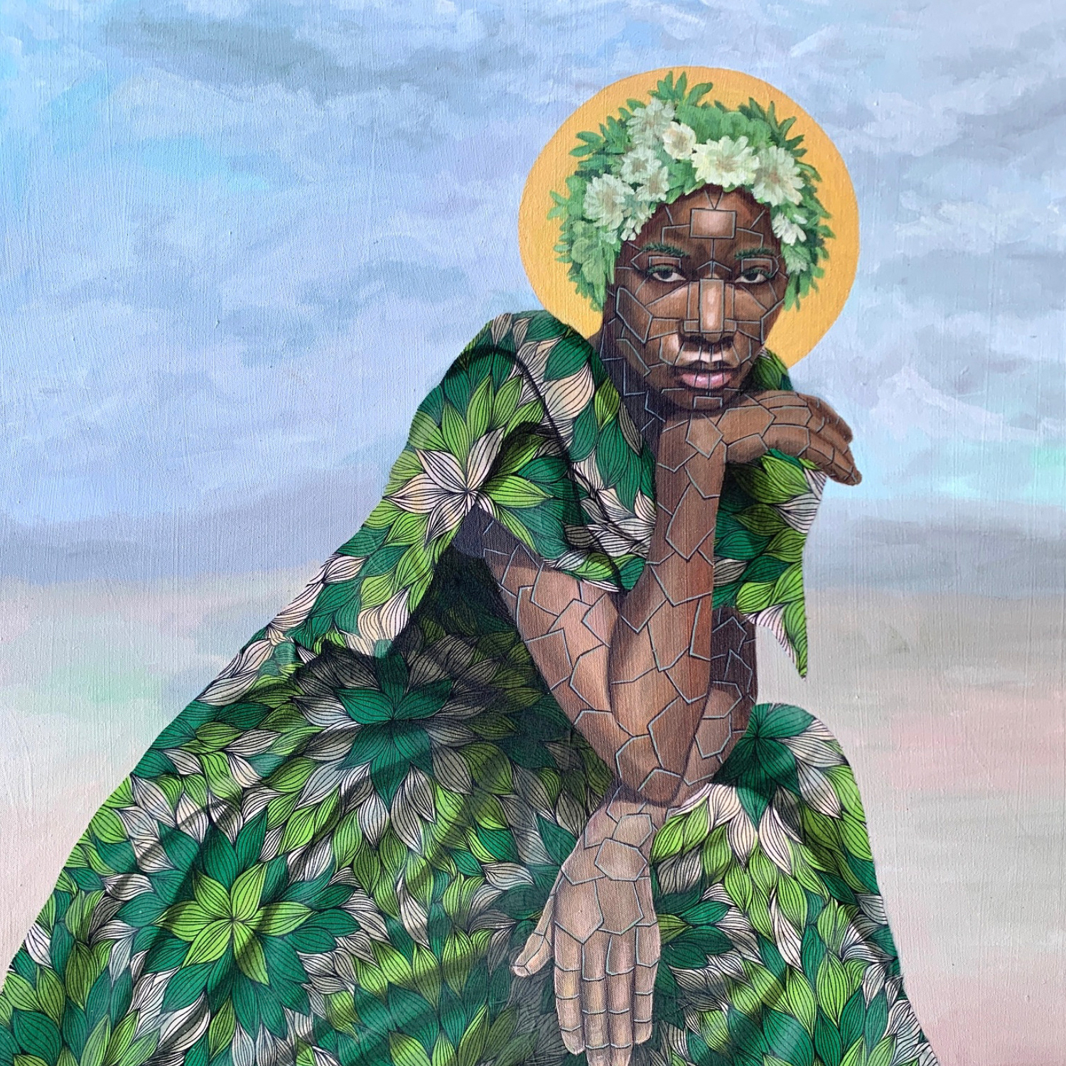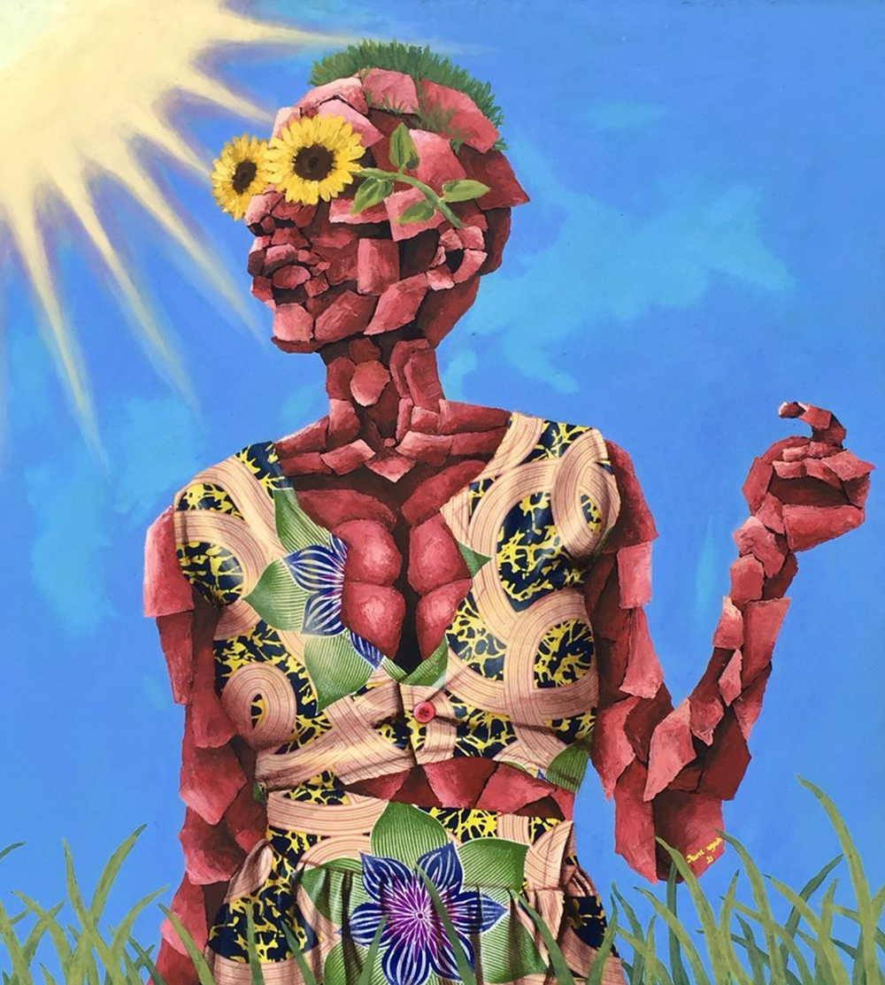 Jane Eveshodioni Ugah (b. 2000) is a Nigerian visual artist from the rocky town of Ososo, Edo State. She holds a B.A. in Fine and Applied Arts from the University of Benin, Benin City. Drawing inspiration from nature as both subject and aesthetic strategy, Ugah creates surreal figures whose essence is deeply embedded in natural landscapes, evoking themes of escape, human relationships, cultural and religious mythology, and the interconnectedness of ecosystems. Working with acrylic, oil, wax print fabric, and mixed media, she depicts bodies as fragmented rock layers—metaphors for cracks within the human psyche and the markings of lived experience on the skin. Her work conveys a sense of solitude and tranquillity, offering respite from the intensity of urban life. Ugah has participated in several group exhibitions. She lives and works in Abuja, Nigeria.