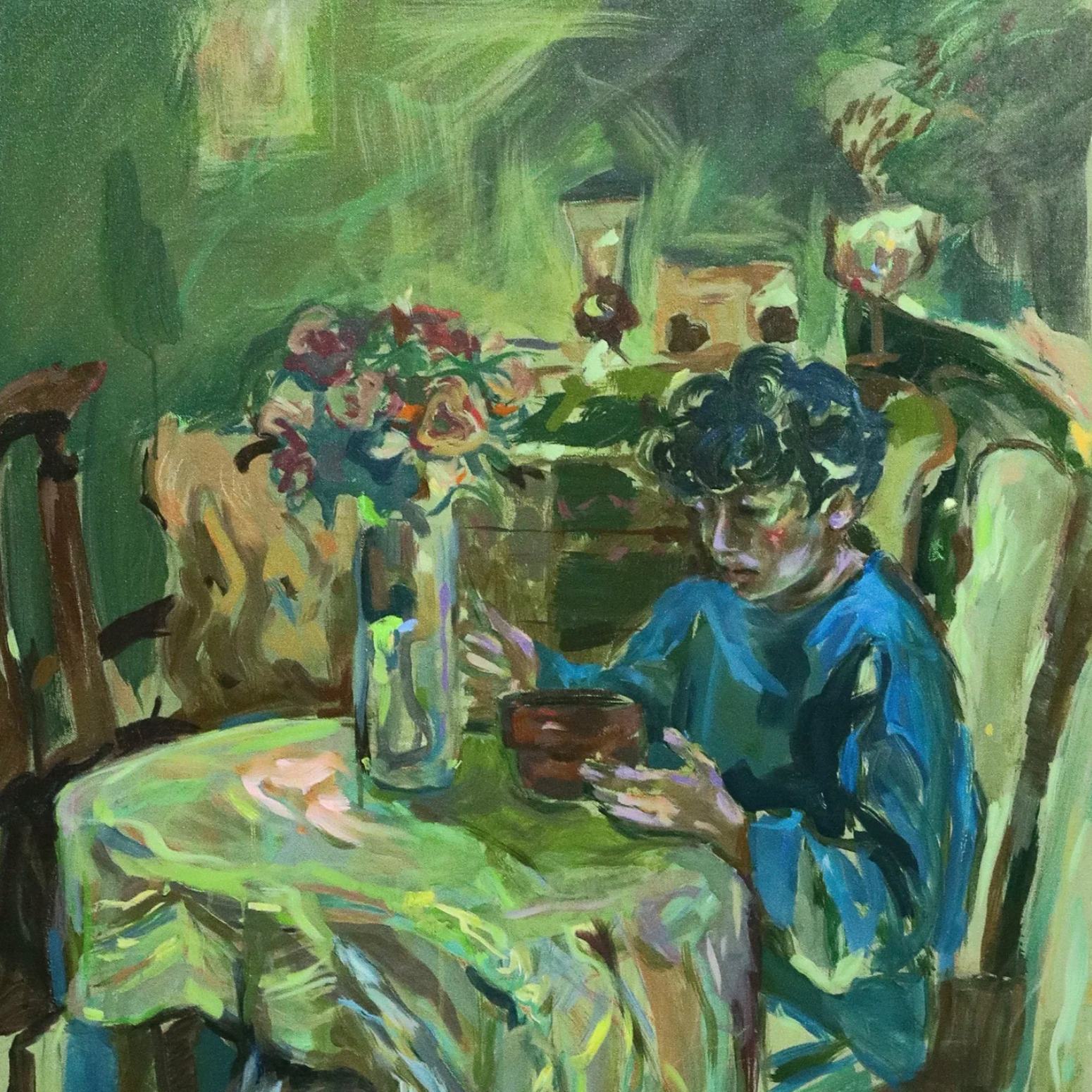 Mariam El Sayed Bakry (b. 1999, Alexandria, Egypt) is an emerging painter whose work explores human connection, memory, and ritual, often using the shared meal as a symbol of intimacy and belonging. A 2023 graduate of the Faculty of Fine Arts, Painting Department, she has exhibited widely across Egypt. Guided by intuition and expressive brushwork, her paintings reveal layered emotional landscapes and everyday moments of togetherness. As both artist and educator, Bakry is steadily cultivating her voice within Egypt’s contemporary art scene.