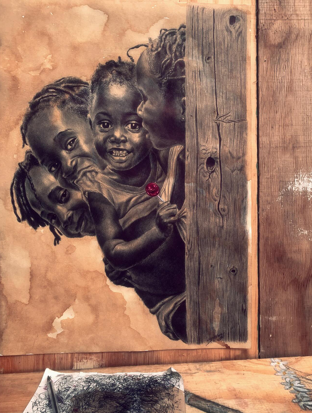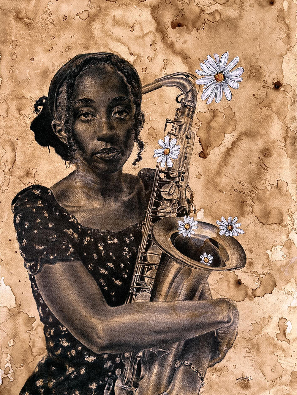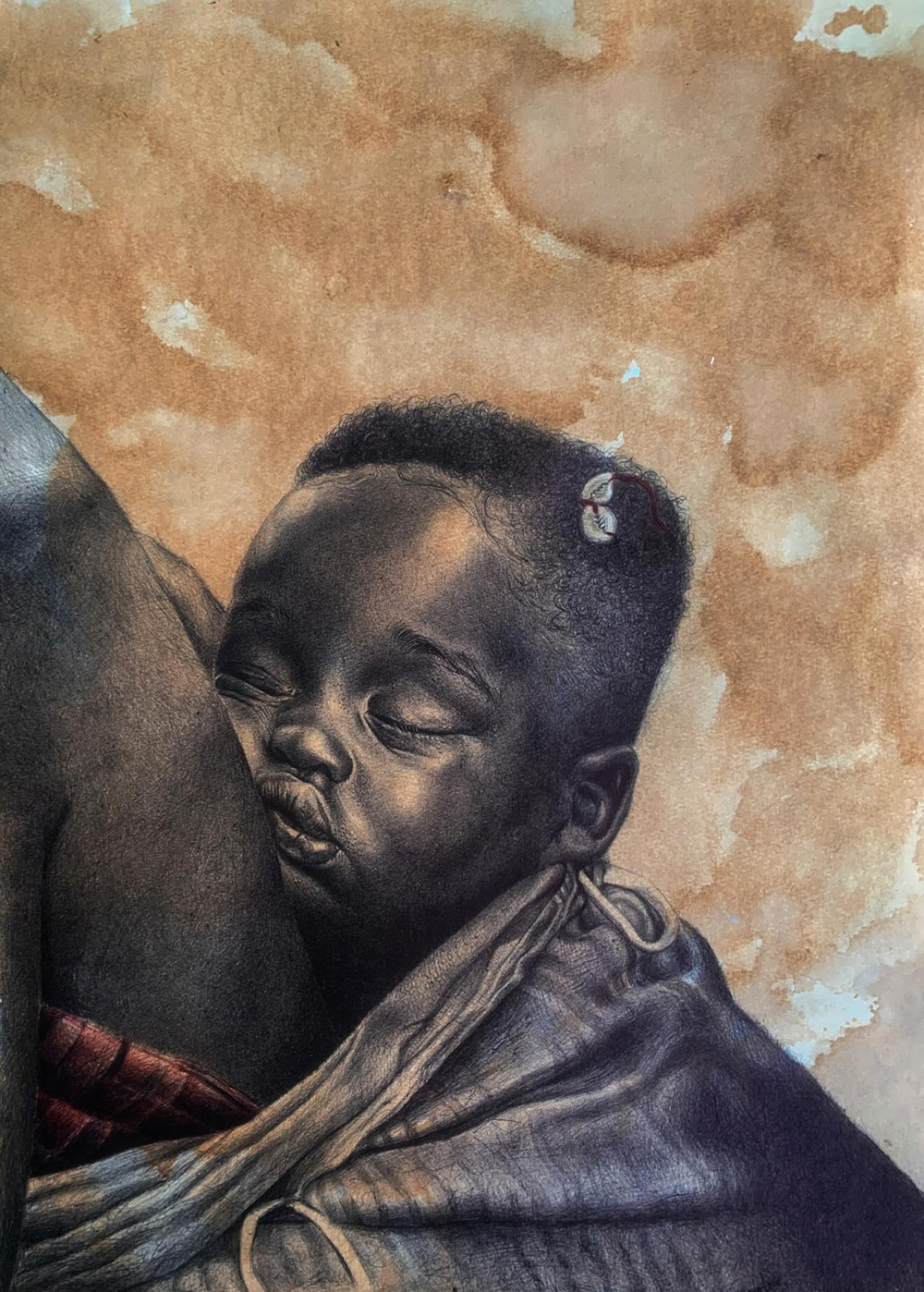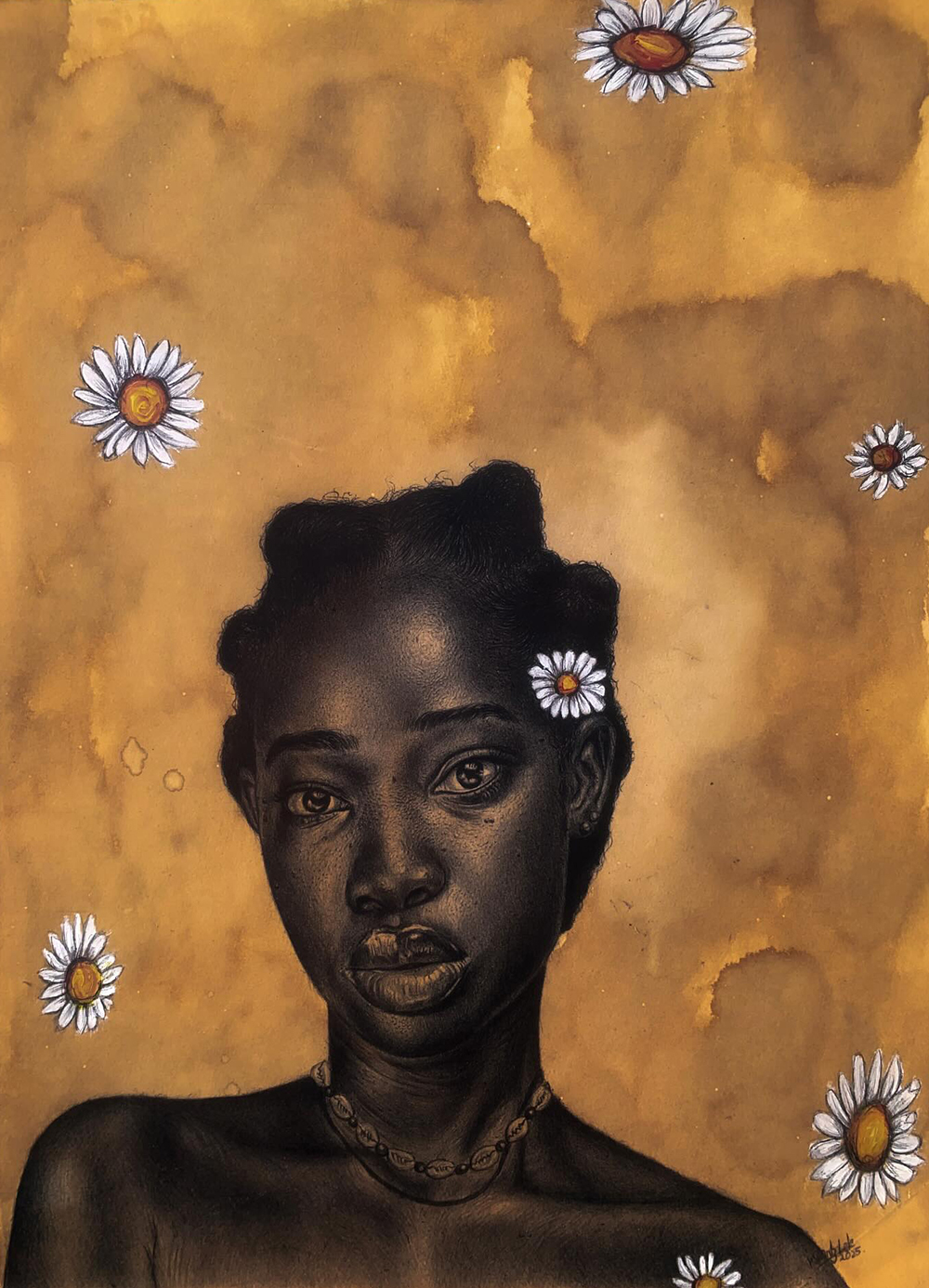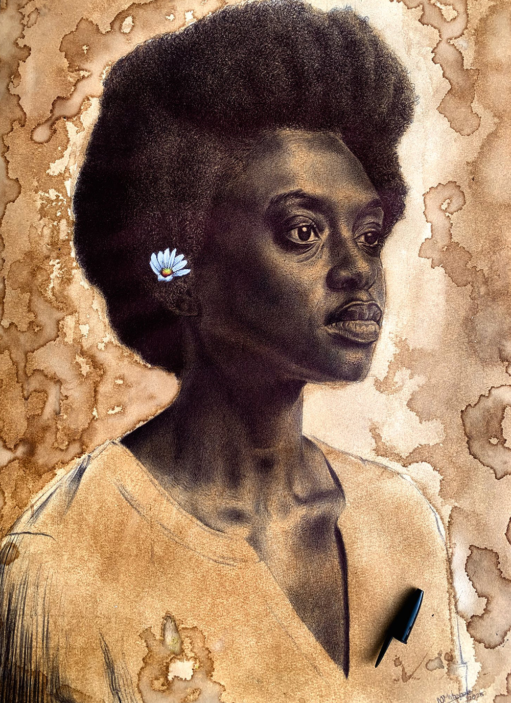Mncobi Mndzebele is a self-taught contemporary artist from Eswatini whose striking works explore African identity, culture and womanhood through everyday materials like ballpoint pen and coffee stains. His signature process involves wetting paper with coffee to create rich, sepia-toned backgrounds, then drawing fine, expressive portraits that celebrate the beauty and resilience of Black African skin and heritage. Driven by a desire to translate personal memories and the strength of women shaped by his upbringing in a single-mother household, Mndzebele’s art invites diverse viewers to see and interpret their own stories in his work.