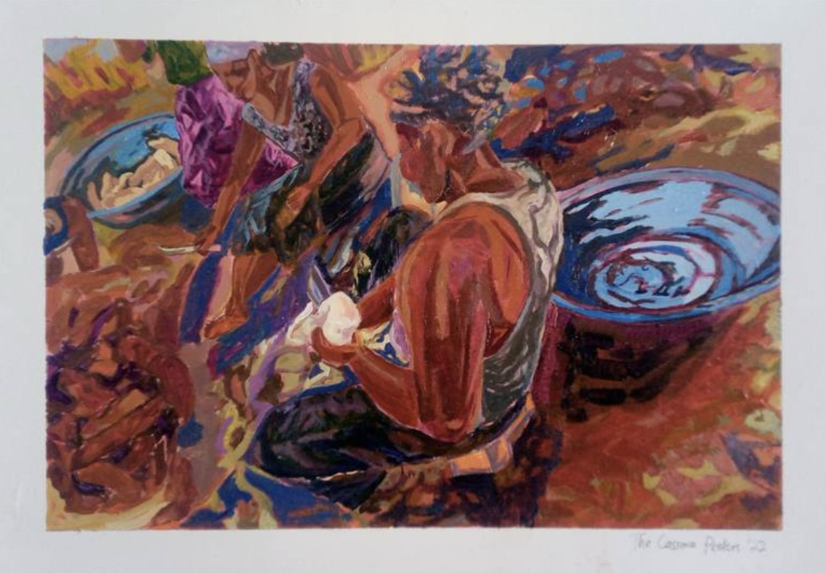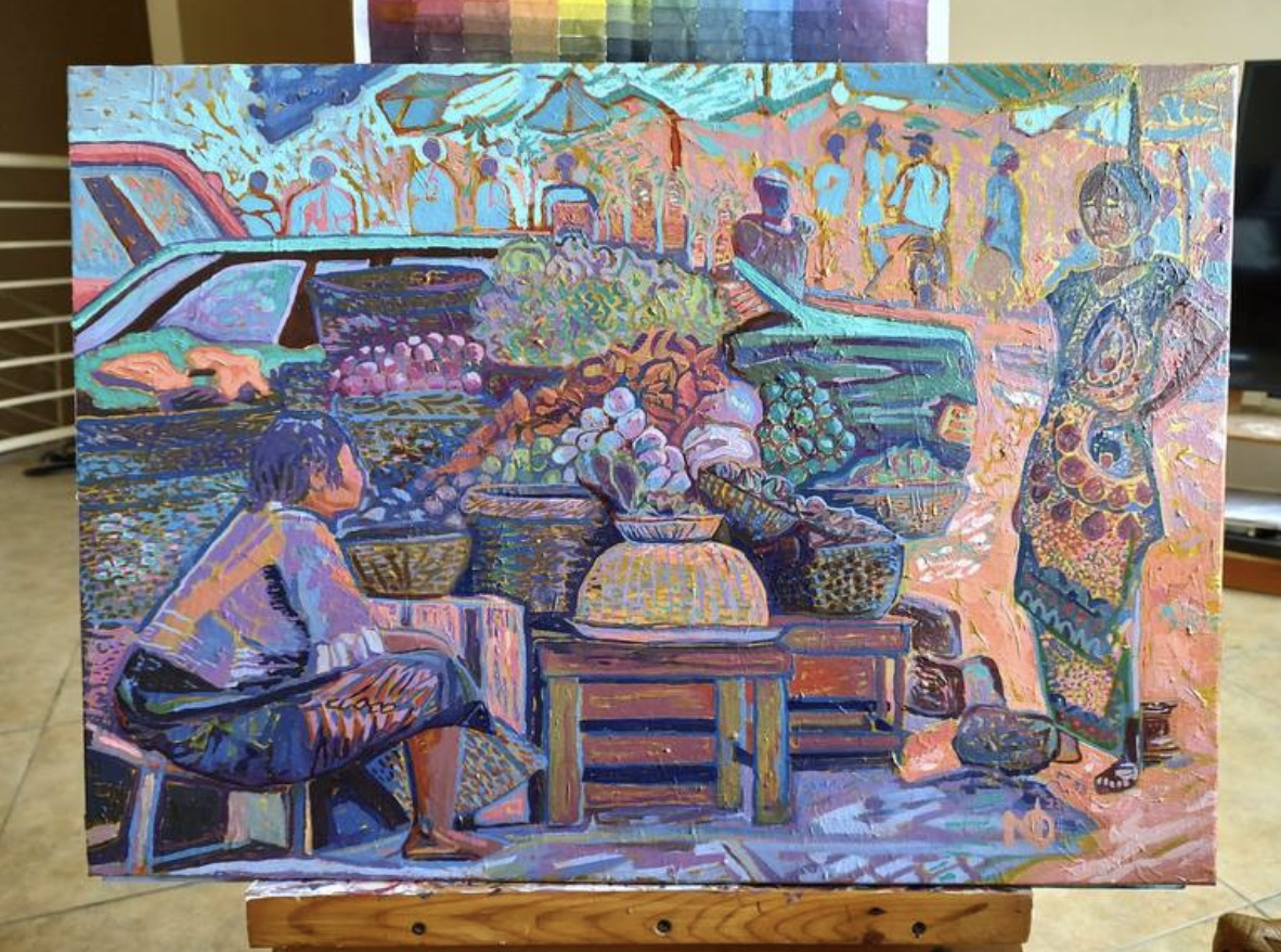 Nancy Okang is a Ghanaian artist whose work is rooted in open-impressionism and fauvism, characterized by bold colors and expressive brushwork. She creates art as an invitation to escape into a world of color and joy, drawing deep inspiration from the ever-evolving social landscapes of Ghana. Beyond the studio, Nancy is deeply committed to teaching the Bible and supporting the spiritual and personal growth of others by sharing valuable resources. She recreates these shared moments using acrylics, oils, or pastels on cardstock—or canvas when possible—turning them into vibrant visual narratives.