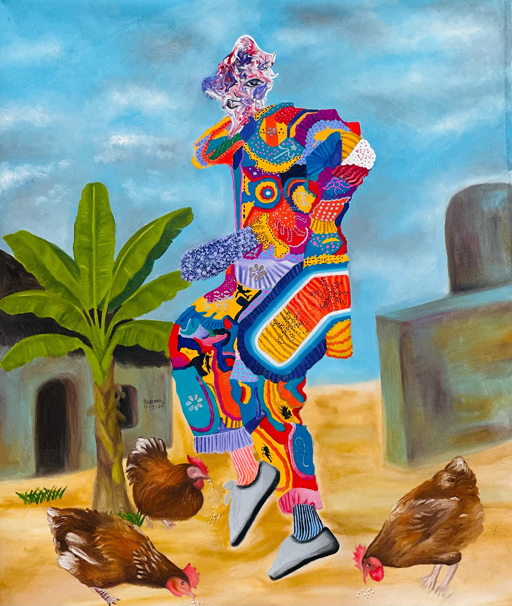 Desmond Nii Kortey Botchway is an artist whose work draws inspiration from the masquerades of the Gulf of Guinea, West Africa, exploring their cultural, spiritual, and communal significance. His practice reflects the intricate masks, vibrant costumes, and symbolic materials central to these performances, which honor ancestors, mark rites of passage, and celebrate seasonal festivals. Through his art, Botchway examines the living connection between people and their cultural heritage, using masquerade traditions as a lens to explore identity, storytelling, and the enduring relationship between past and present.