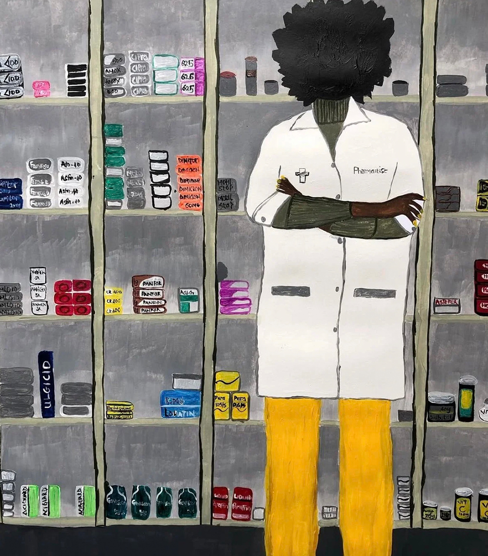 Oluwafunke Saka is a Nigerian-born, UK-based multidisciplinary artist whose work moves between painting, mixed media, and installation, weaving together the precision of her pharmacy background with the emotional depth of her fine art practice. Guided by themes of mental health, spirituality, identity, and transformation, she creates symbolic, atmospheric works where abstraction and figuration meet, forming visual spaces that feel both introspective and universal. Her use of colour tension, thread, and layered forms reflects an ongoing inquiry into vulnerability, power, and the subtle negotiations within the female experience. Saka’s transition from medicine to art marked not a departure but an expansion of purpose—one that bridges the body and the spirit through a methodical yet intuitive process. Her work has been shown in group exhibitions across the UK and is held in both private and public collections, earning recognition for its ability to invite reflection, renewal, and emotional resonance. Beyond her studio, she continues to explore art as a form of care and connection, extending her belief that creativity—like medicine—can help mend what we cannot always name.