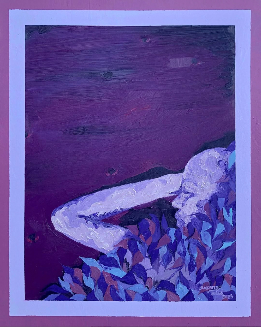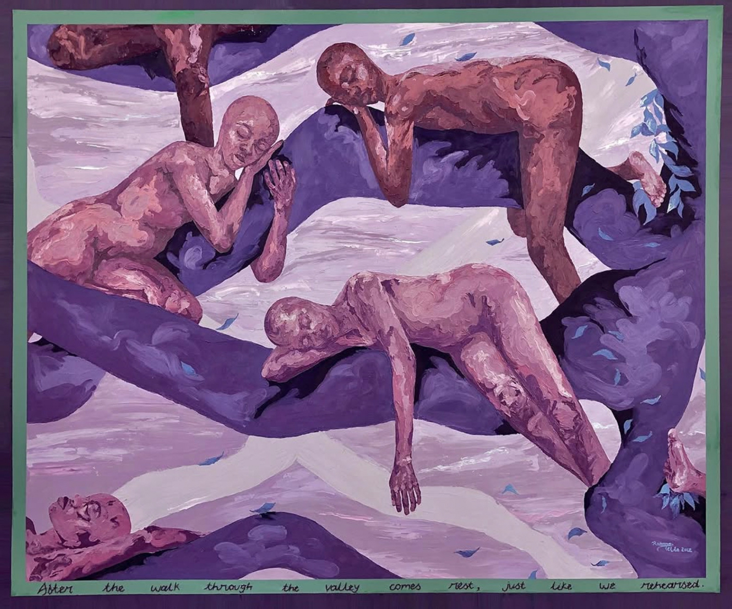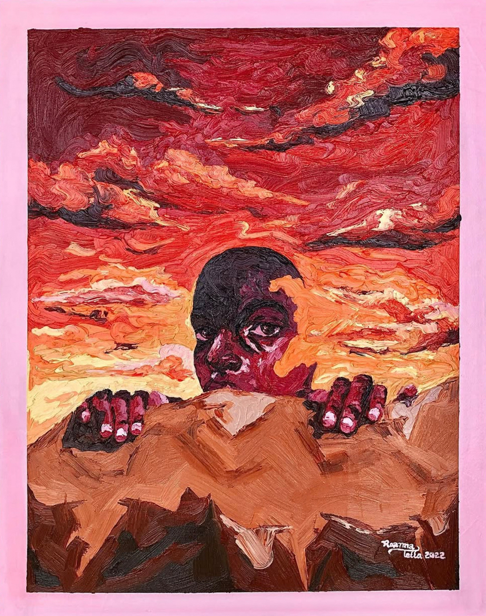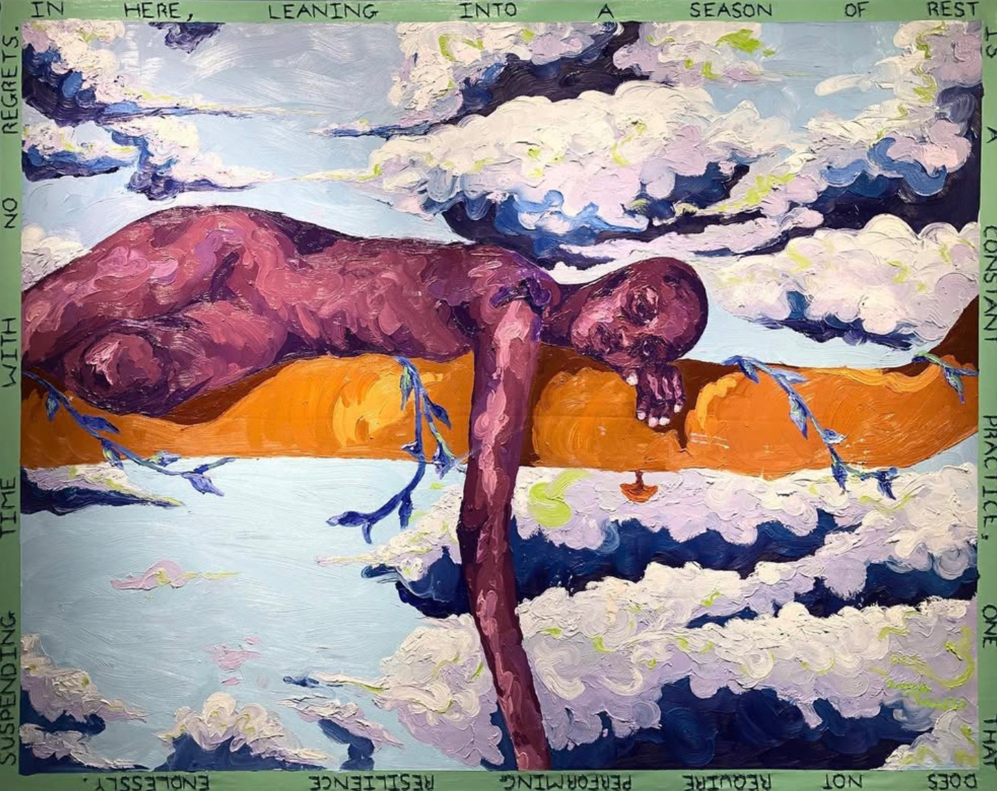 With each brushstroke, Roanna Tella maps the shifting terrain between emotion and memory, vulnerability and resilience. Rooted in introspection, her practice reimagines the human form through gestural abstraction, inviting viewers to witness how the body carries both rest and rupture. In her latest body of work, Foreboding Tales, Tella turns inward, tracing the quiet rituals that tether us to joy and grounding amid uncertainty. Through the symbolism of plants and subtle daily gestures, she explores the coexistence of beauty and distress, asking how both can be held within the same breath. Tella holds a B.A. in Visual Arts from the University of Lagos and has exhibited widely across Nigeria and internationally; her evolving practice continues to deepen through mentorship and a sustained commitment to emotional truth in visual form.