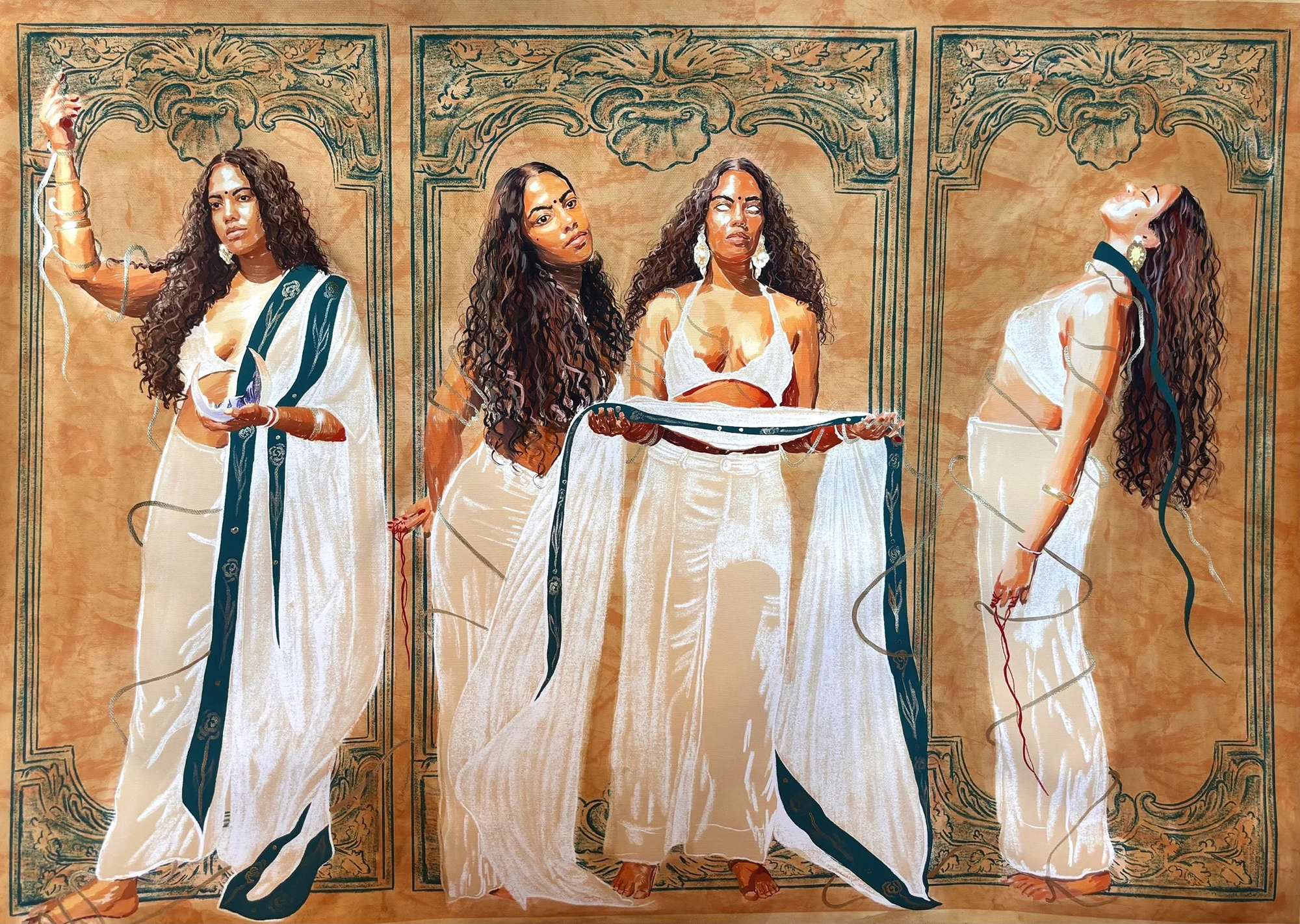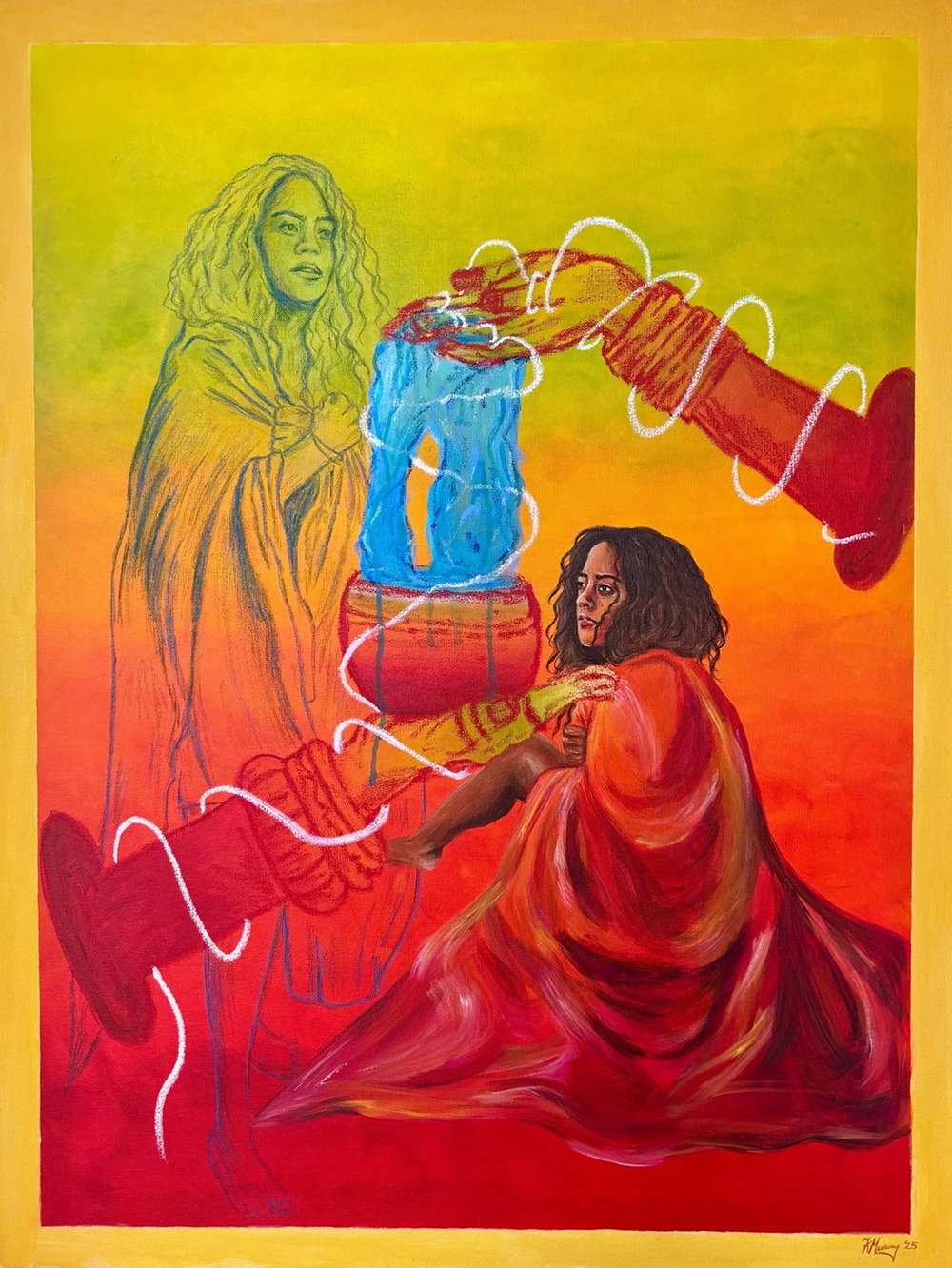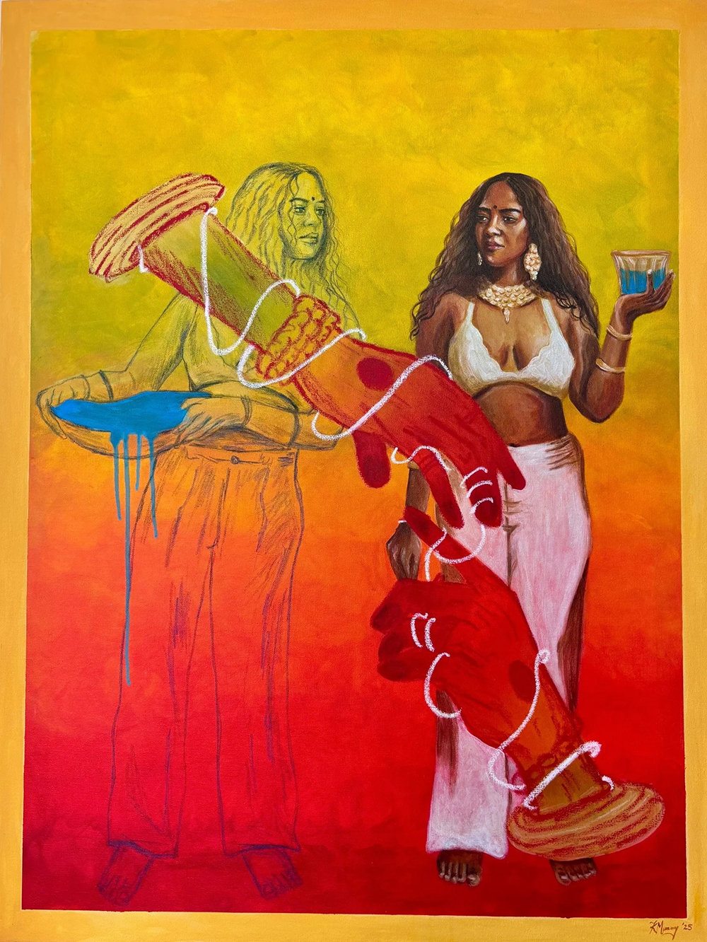 Tayhe Munsamy is a multidisciplinary artist born and raised in Johannesburg, South Africa, currently based in London. A graduate of Goldsmiths, University of London, she holds a BA in Fine Art and History of Art (First-Class Honours, 2020) and a Master’s in Contemporary Art Theory (Distinction, 2024). Her practice operates within speculative thinking, fictioning, mythology, and folklore, weaving together her identity as a mixed-race woman with narratives drawn from Coloured and Indian communities in South Africa. Through painting, performance, digital media, and writing, she blends cultural specificity and historical archives with fictional elements to explore themes of creation, ancestral memory, womanhood, survival, and care. Her recent research examines food spaces as sites of resistance and intergenerational knowledge during Apartheid, further deepening her exploration of personal and collective histories.