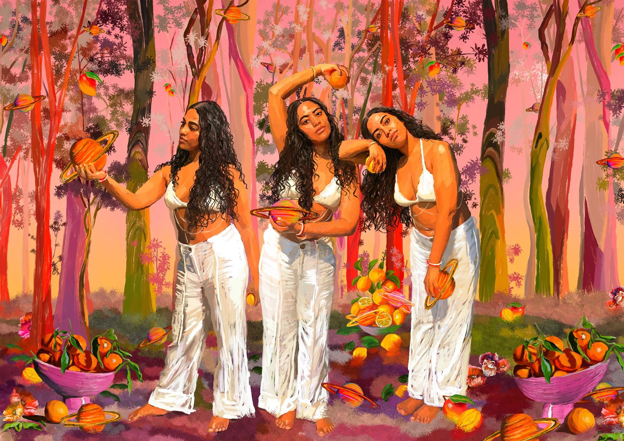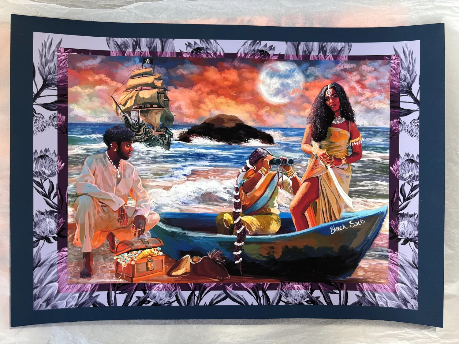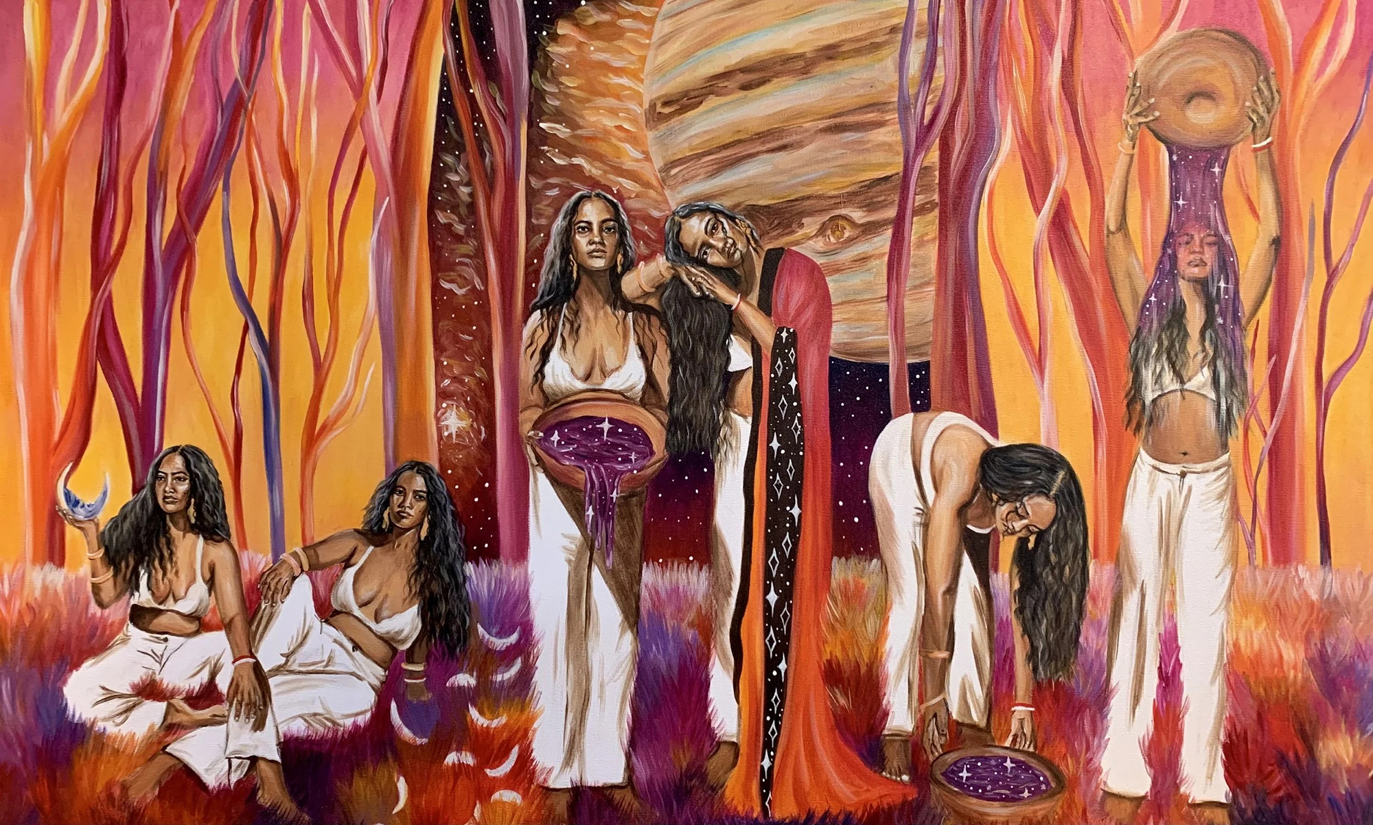 Tayhe Munsamy is a multidisciplinary artist born and raised in Johannesburg, South Africa, currently based in London. A graduate of Goldsmiths, University of London, she holds a BA in Fine Art and History of Art (First-Class Honours, 2020) and a Master’s in Contemporary Art Theory (Distinction, 2024). Her practice operates within speculative thinking, fictioning, mythology, and folklore, weaving together her identity as a mixed-race woman with narratives drawn from Coloured and Indian communities in South Africa. Through painting, performance, digital media, and writing, she blends cultural specificity and historical archives with fictional elements to explore themes of creation, ancestral memory, womanhood, survival, and care. Her recent research examines food spaces as sites of resistance and intergenerational knowledge during Apartheid, further deepening her exploration of personal and collective histories.