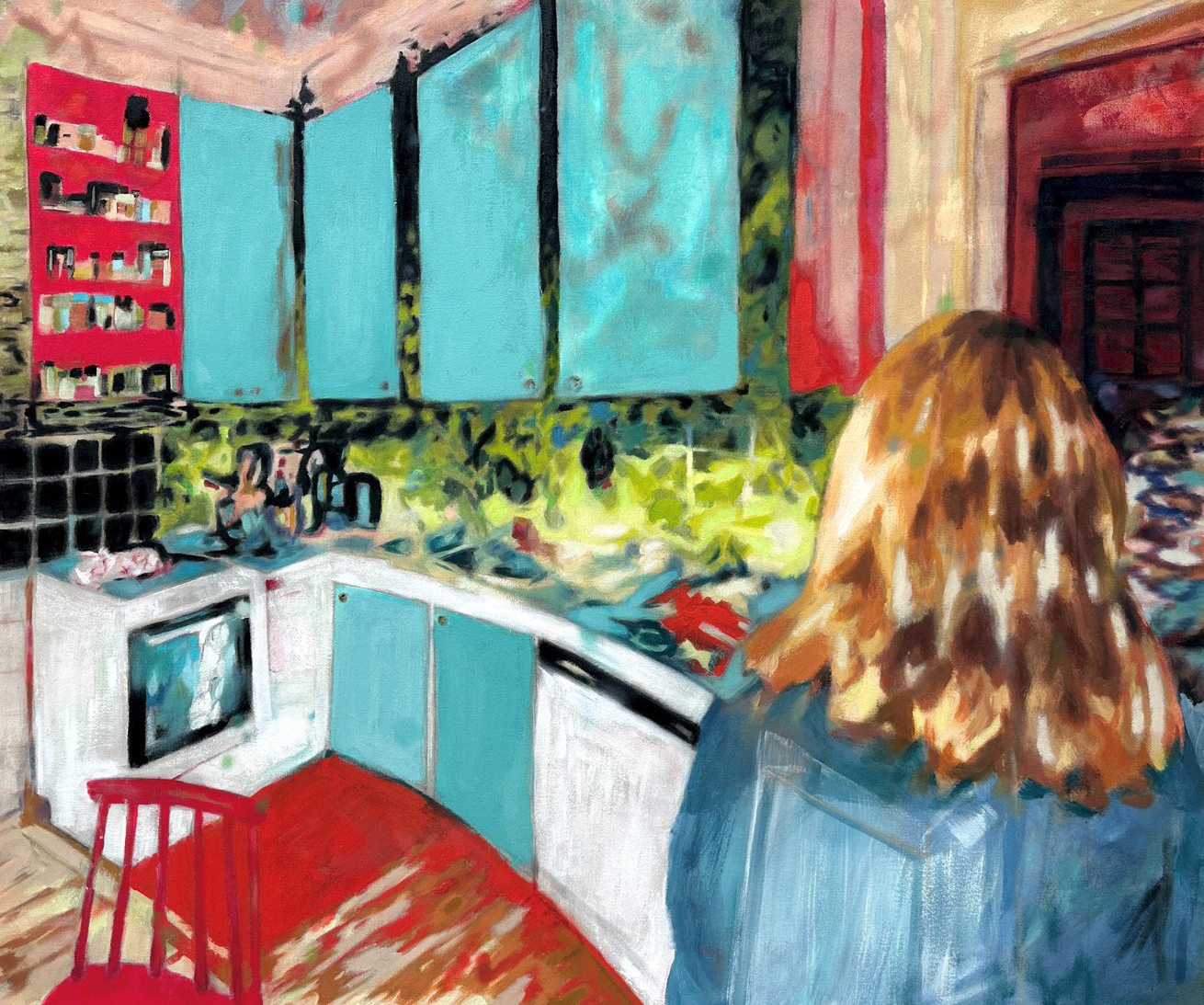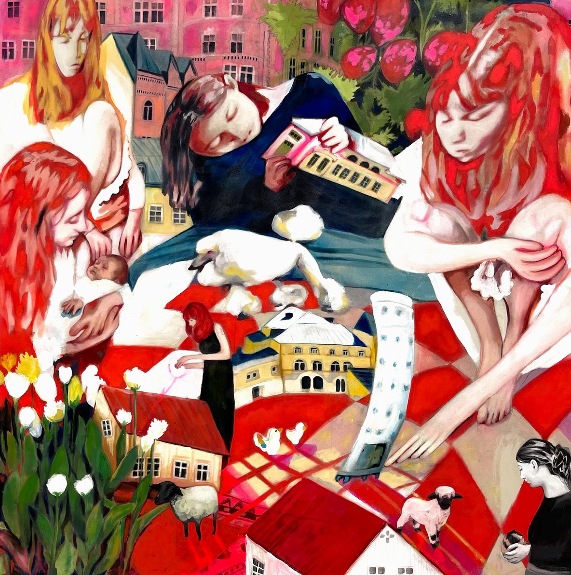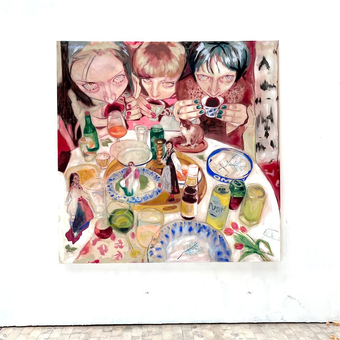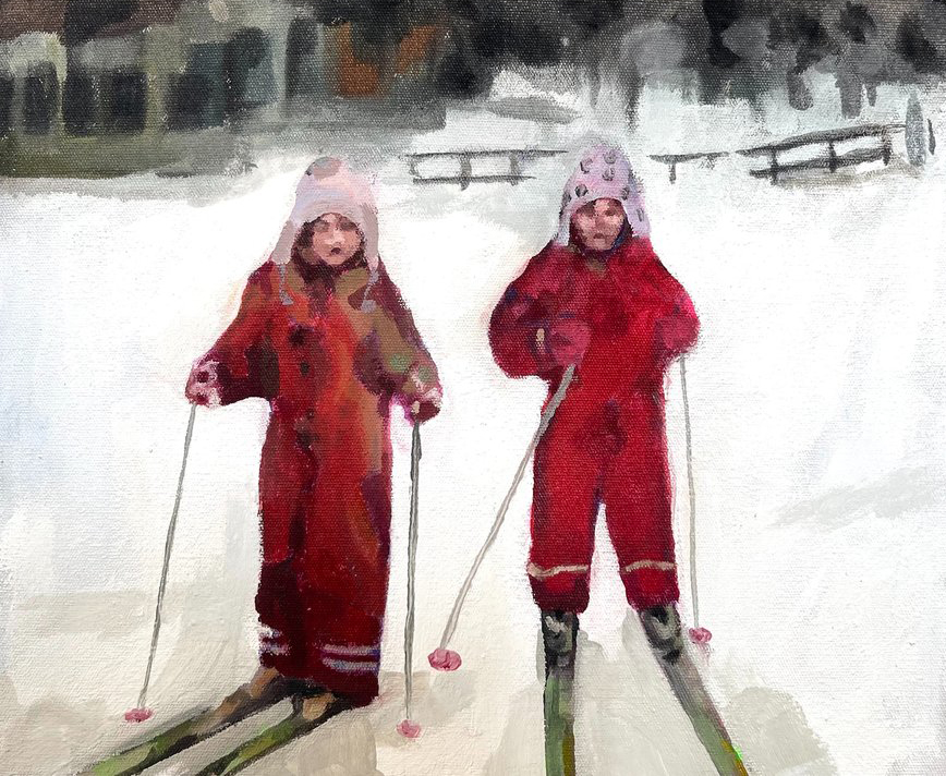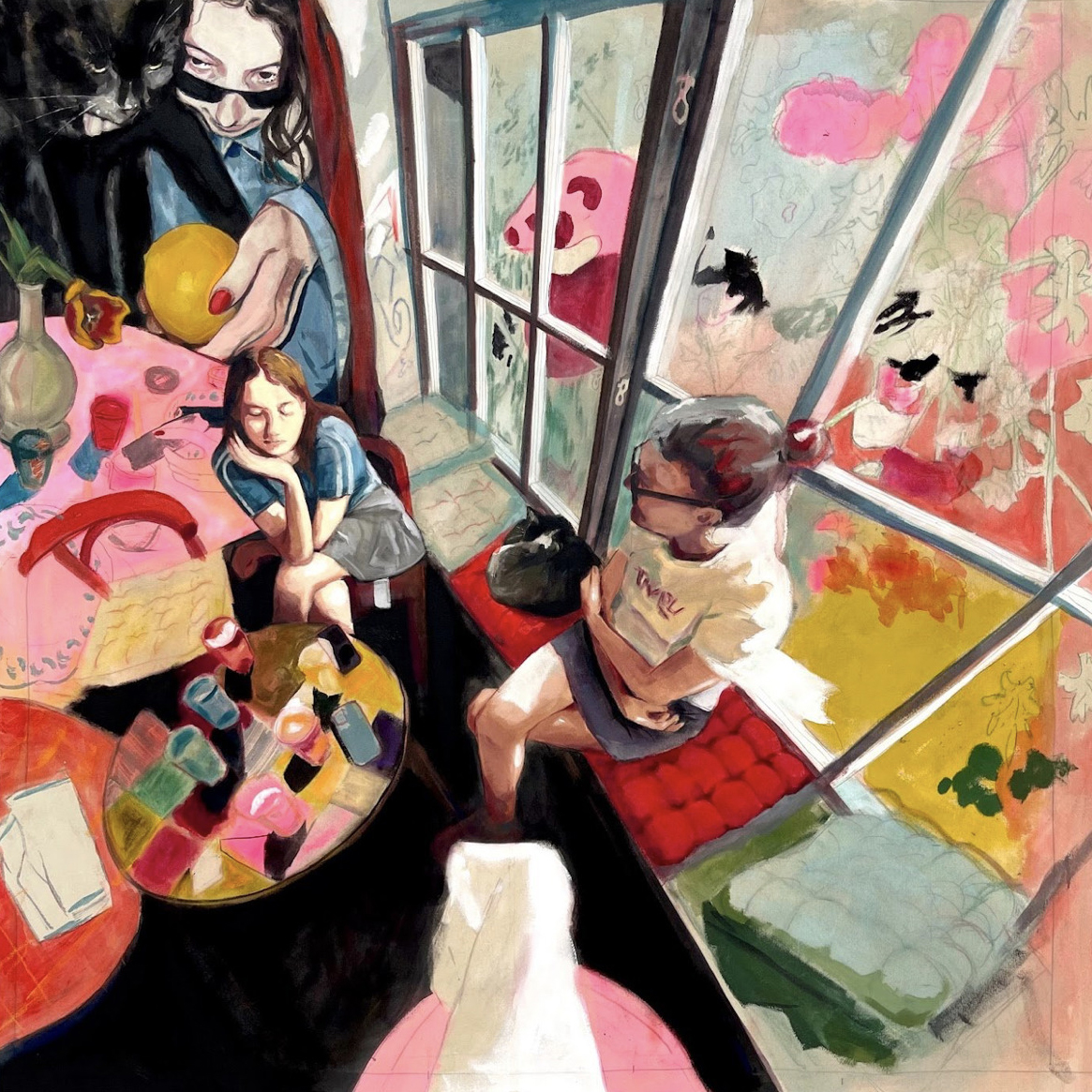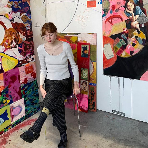 Tindra Ferner (b. 2002) is a Swedish artist from Hedemora, Dalarna, currently living and working in Bergen, Norway. She is pursuing a Bachelor of Fine Arts at the Faculty of Fine Art, Music and Design (KMD) at the University of Bergen. Ferner primarily works with large-scale acrylic paintings, often constructed through a collage-based process that combines personal and archival imagery. Her work explores themes of time, memory, and perception, frequently incorporating distorted perspectives and layered dimensions. By intertwining fragments from her own camera roll with family photo albums, she creates visual timelines where memory, imagination, and reality intersect and collide.