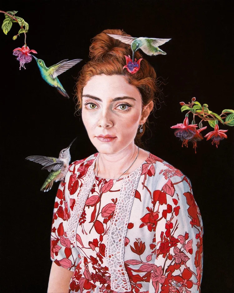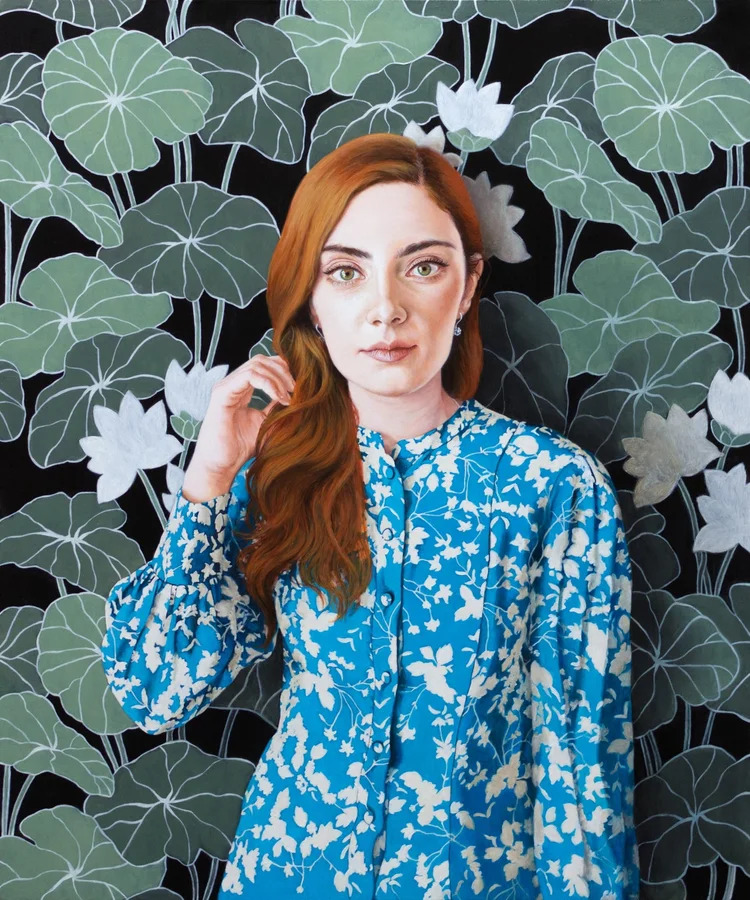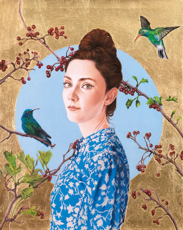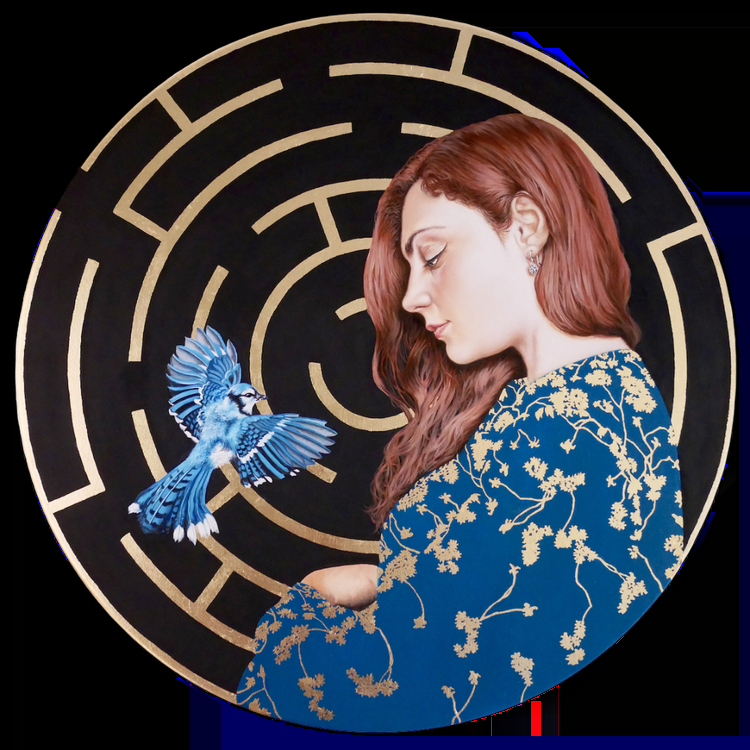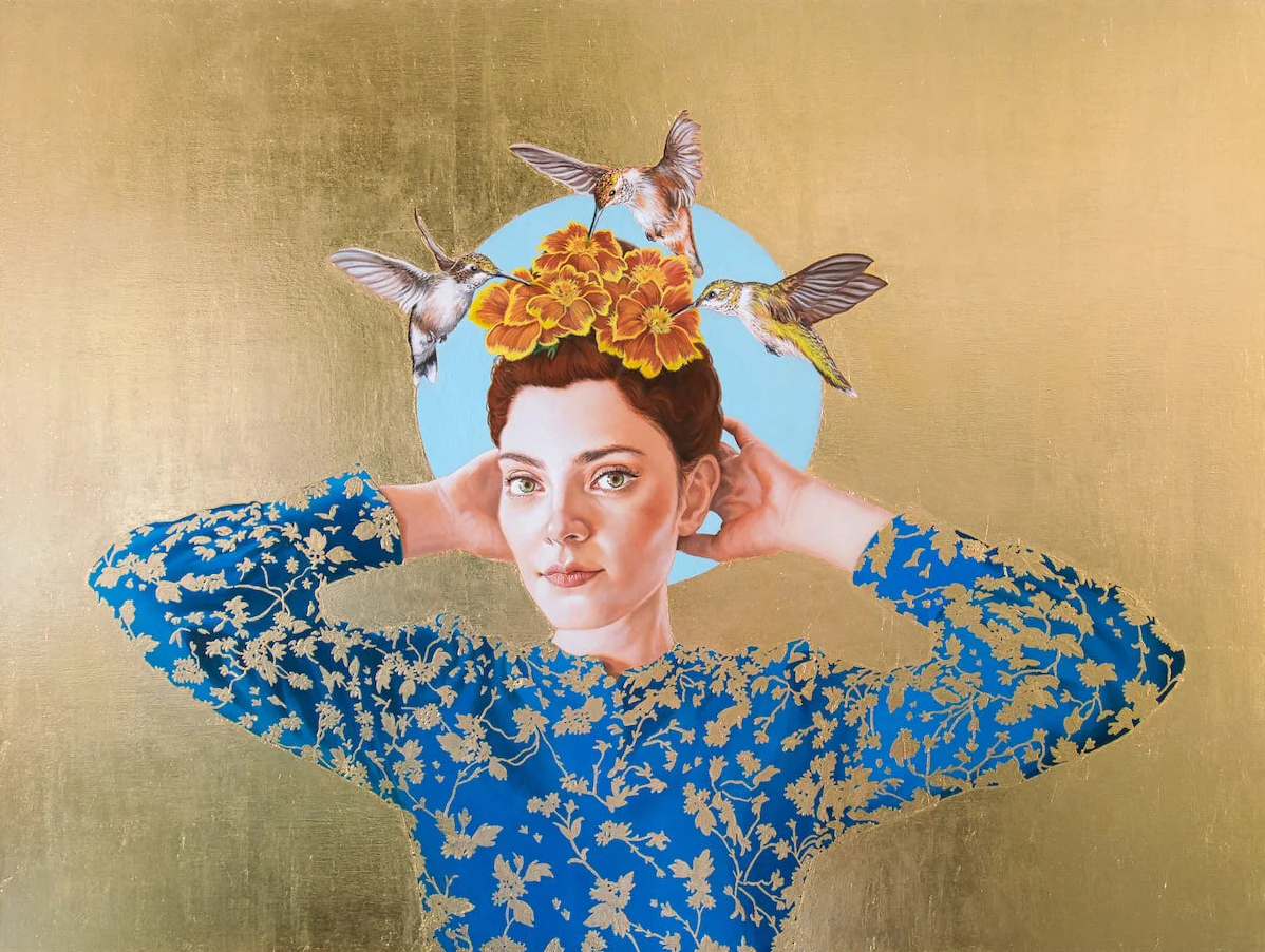 Valentina Porcelli is an Italian figurative artist whose work explores the delicate balance between realism and metaphysical symbolism. A graduate with honors in painting from the Academy of Fine Arts in Foggia, she began her artistic journey in childhood with a strong inclination toward portraiture. Influenced by traditional European painting and photography, Porcelli refined her mastery of oil techniques, while her experience in theater deepened her understanding of the body’s expressive power. In 2016, she crystallized her vision into a distinctive style that pairs monochromatic backgrounds with emotionally charged figures, earning her the first painting prize at the Salerno Youth Biennial and recognition in Frattura Scomposta Contemporary Art Magazine. Over time, her compositions evolved from immersive blue backgrounds to symbolic circular forms and, later, the incorporation of gold leaf, birds, and plants. Centered on female figures who often meet the viewer’s gaze, her paintings invite intimate dialogue while symbolizing a poetic reunion between humanity and nature. Porcelli currently lives and works in Parma, Italy.