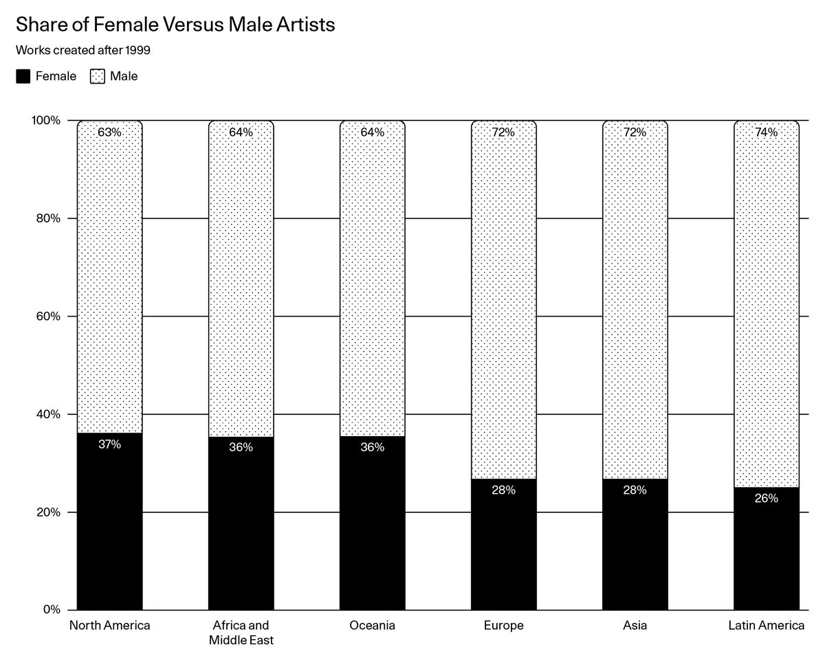 As shown here in a brief analysis, efforts to analyze this context in the domain of the contemporary art world can be aided by online art platforms. Data from these platforms help answer not only questions about gender, but also race and ethnicity, age, career stage, and socioeconomic status. And not only about inequality, but also networks and curation, the shifting influence of roles and institutions, the position of art in social life, the tastes and demographics of collectors, and the emerging sway of algorithmic recommendation systems and social media. In other words, the marriage of these platforms with scholarly research will teach us more than ever before about the roles, patterns, and processes that together (re)produce the art world as we know it.