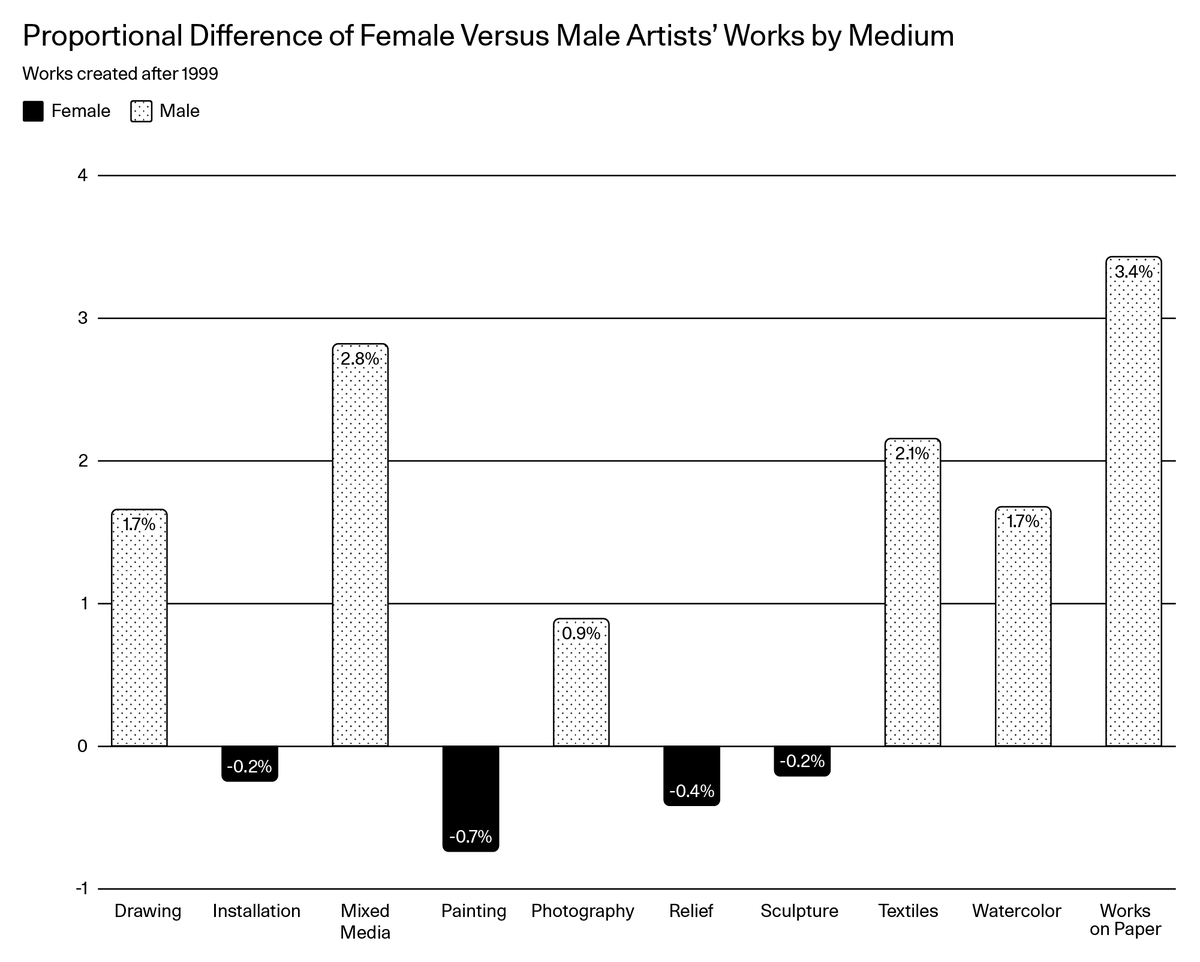 The above chart indicates that, although they are small, some differences in the media used by male and female artists exist, with the notable observation that men remain the dominant producers of conventional media, such as painting and sculpture.